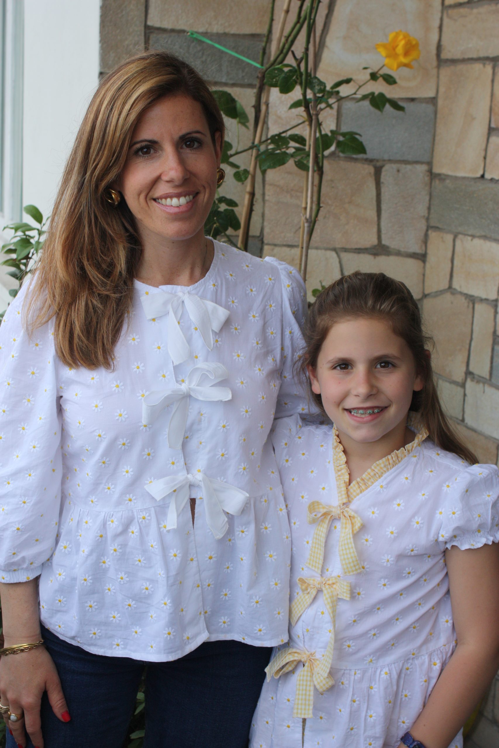 La camicia da Donna è realizzata in cotone ricamato con le margherite, allacciatura con i fiocchetti e maniche a palloncino, è un modello unico ed elegante da abbinare alle camicette da bambina.