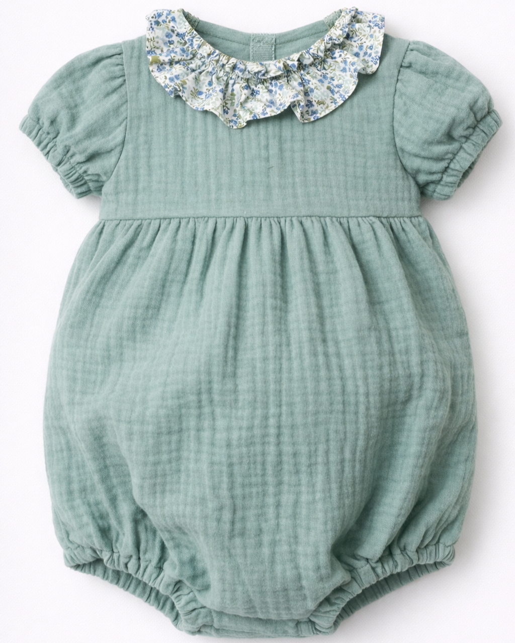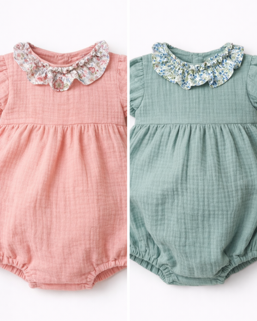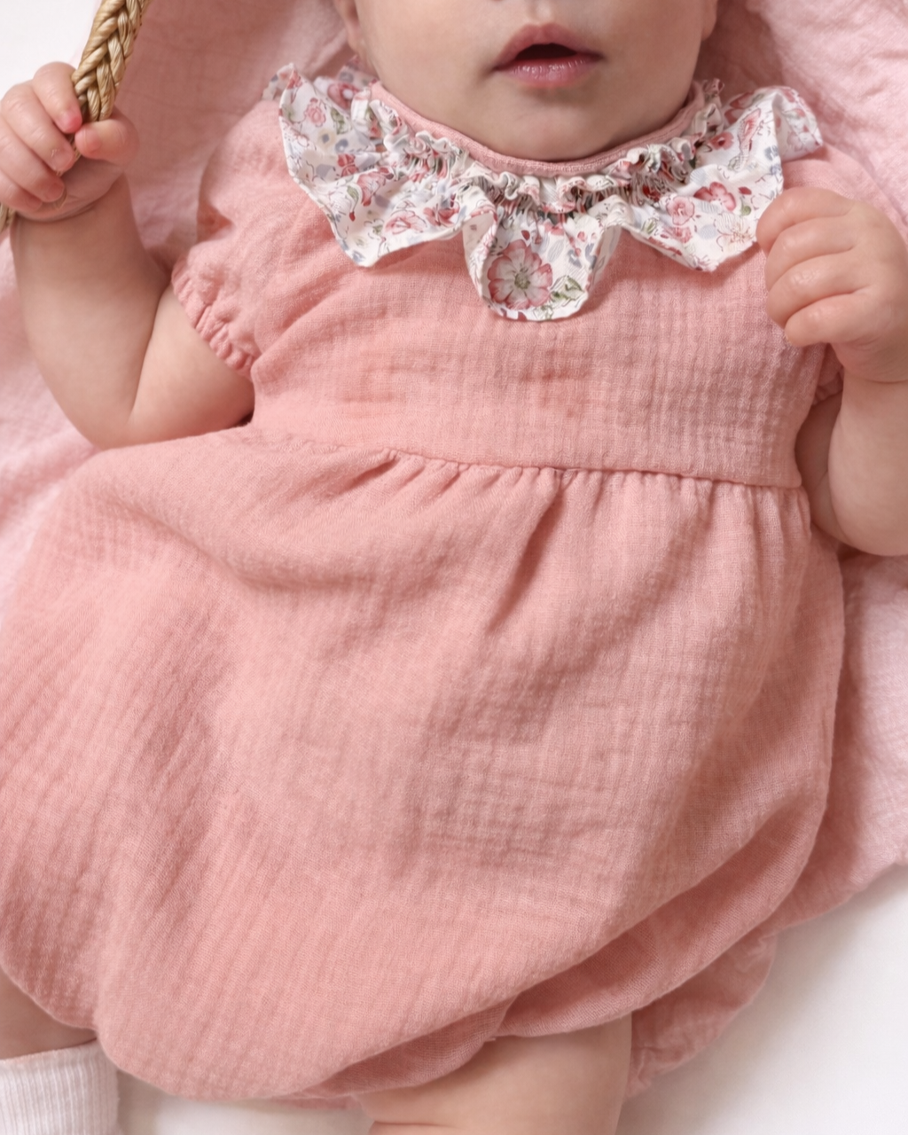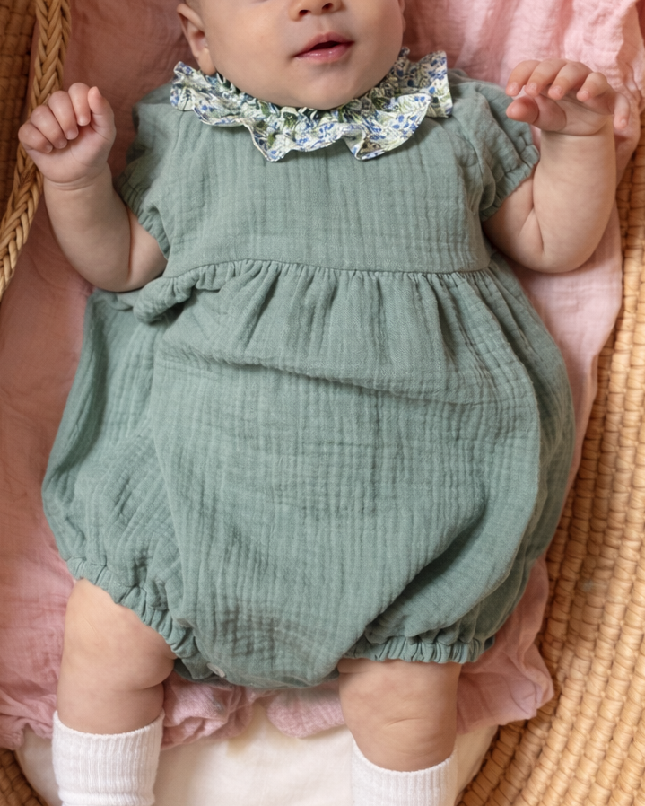 Il Pagliaccetto è realizzato in mussola di puro cotone tinta unita, morbida e delicata sulla pelle. Il dettaglio rouche sul collo con piccolo smock e le maniche a palloncino aggiungono un tocco raffinato, perfetto per accompagnare le bimbe con stile.